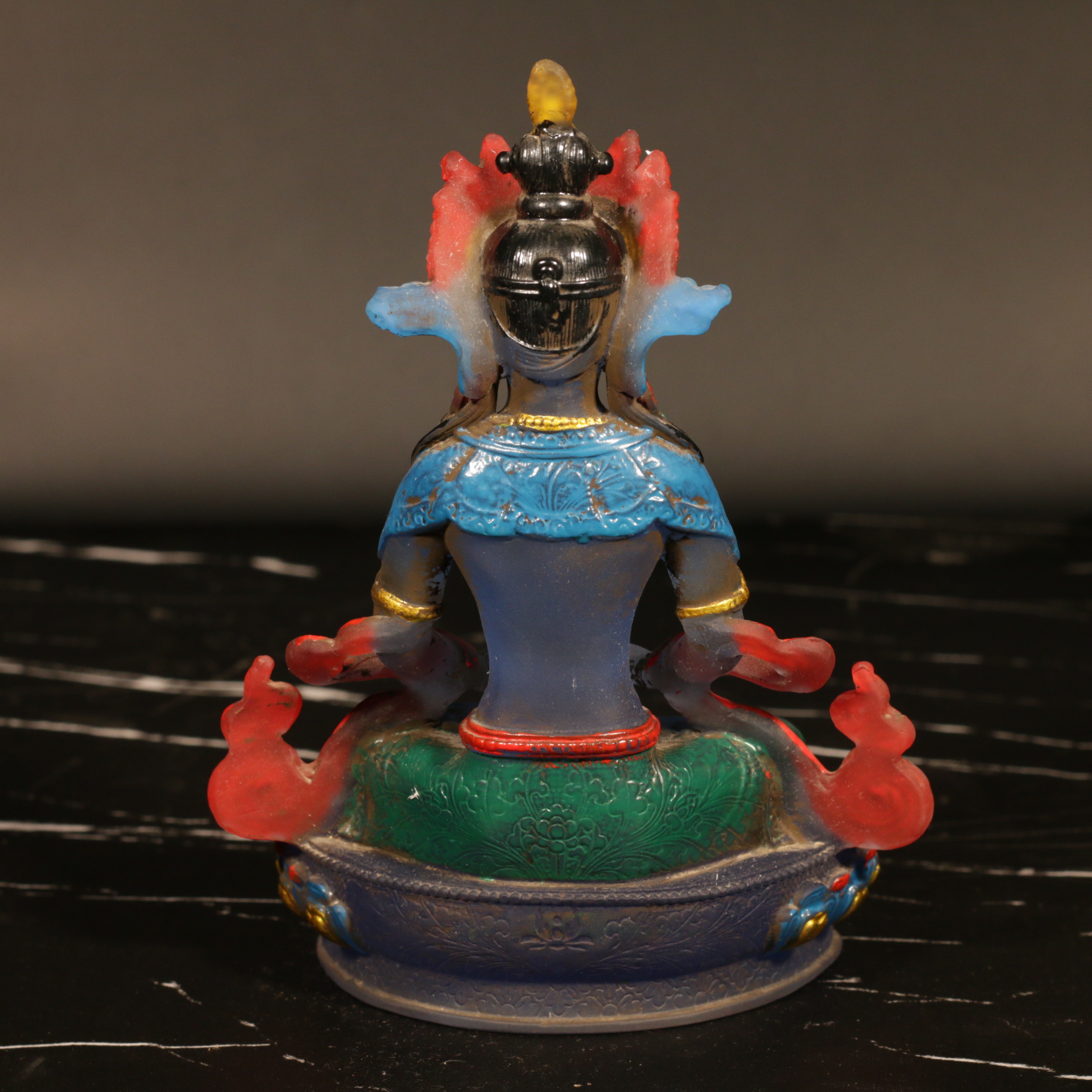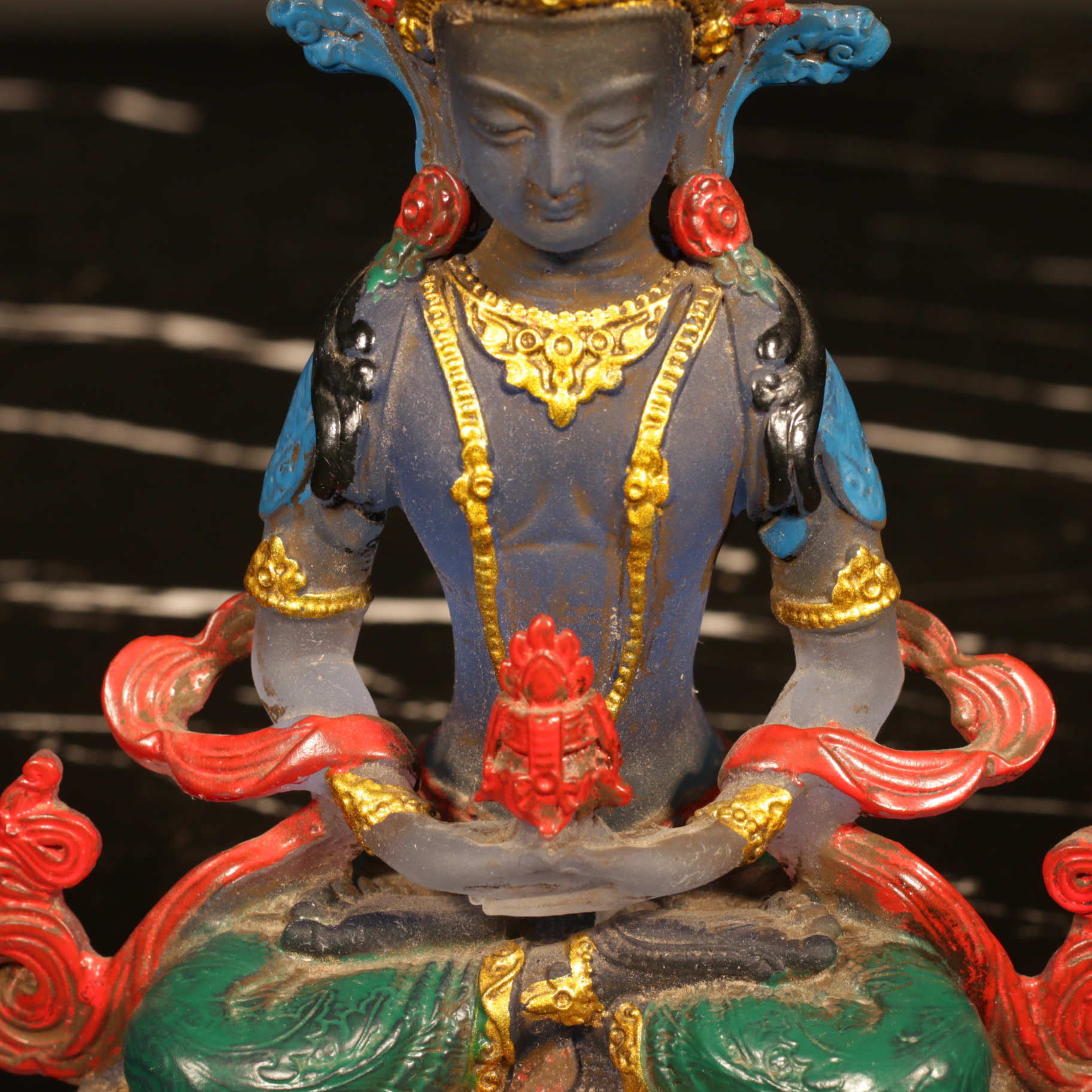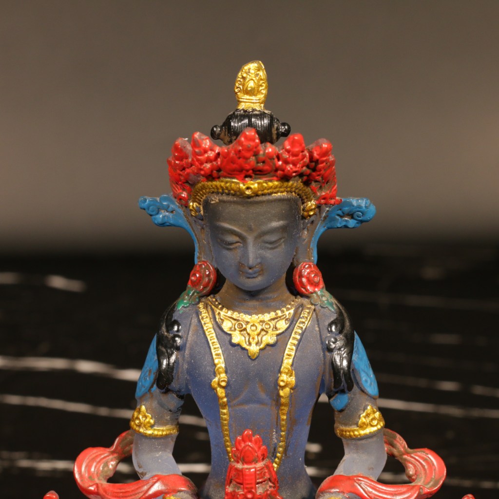 Đức Phật Vô Lượng Thọ, với trí tuệ thù thắng, đứng trong tư thế thiền định với hai tay kết ấn. Trên lòng hai tay Ngài đặt bảo bình đầy cam lồ bất tử, biểu trưng cho sự viên mãn. Thân Ngài mang sắc đỏ, tượng trưng cho Đại hỷ lạc, với ba mươi hai tướng tốt và tám mươi vẻ đẹp. Ngài được trang hoàng bằng thiên y, tua lụa và bảo báu rực rỡ, thể hiện hình tướng Báo thân của một vị Phật.